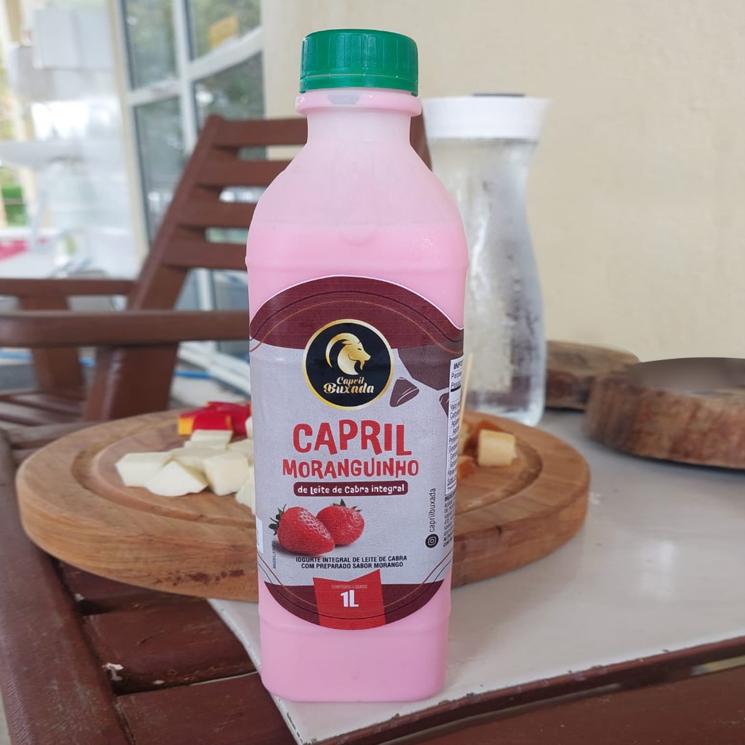 Produzido com iogurte natural de leite de cabra e polpa de morango, oferecendo sabor equilibrado e baixo teor de açúcar adicionado.